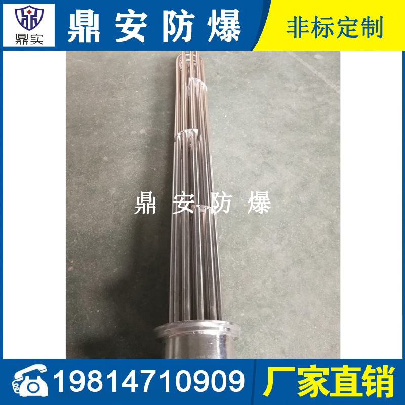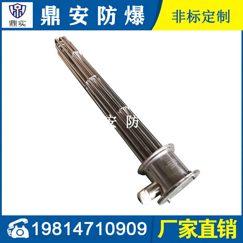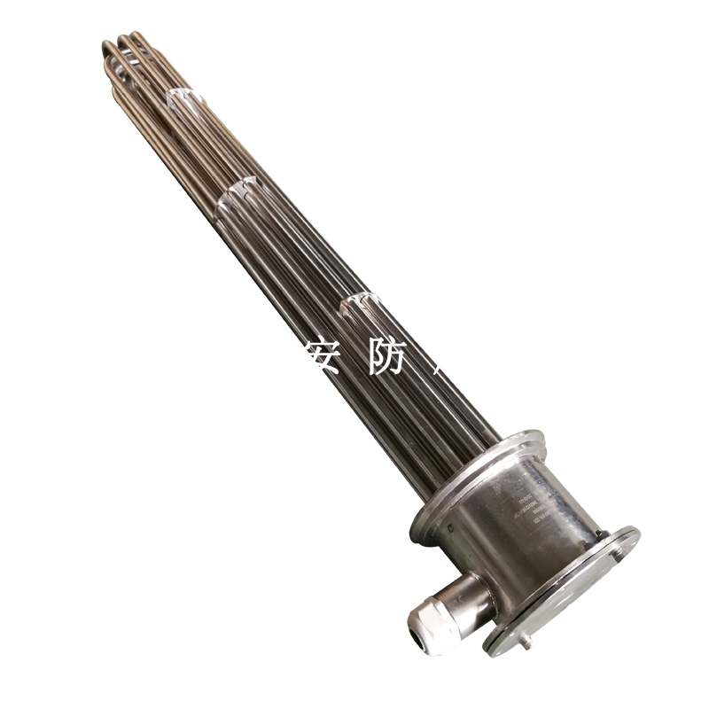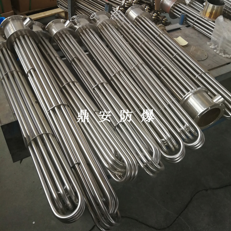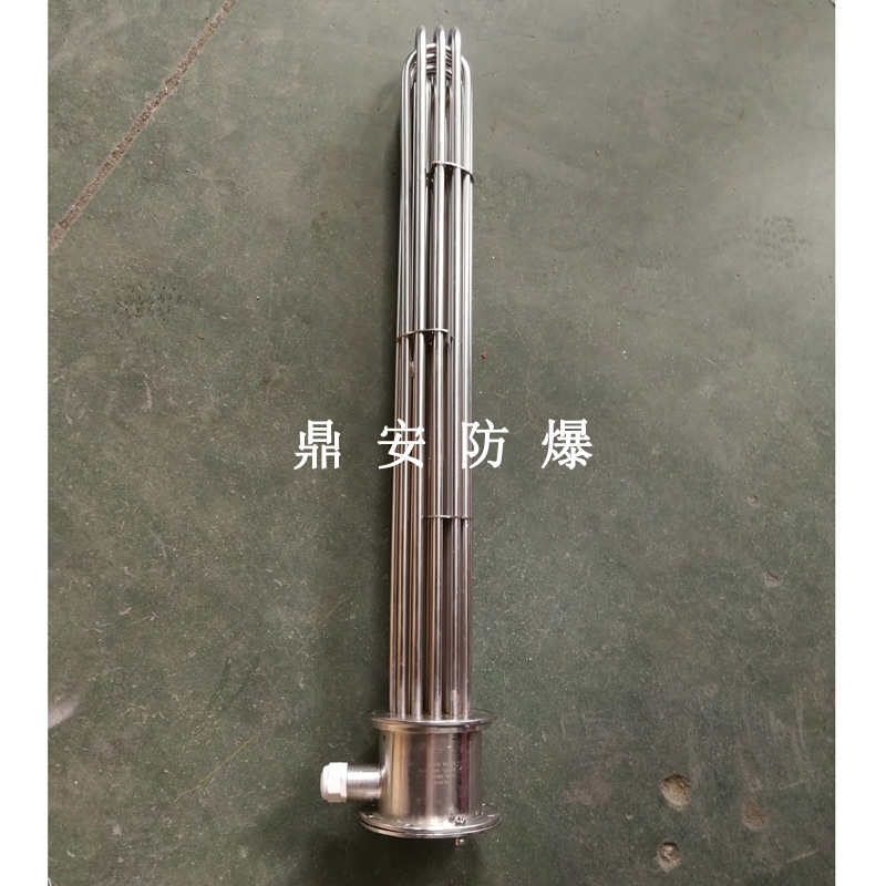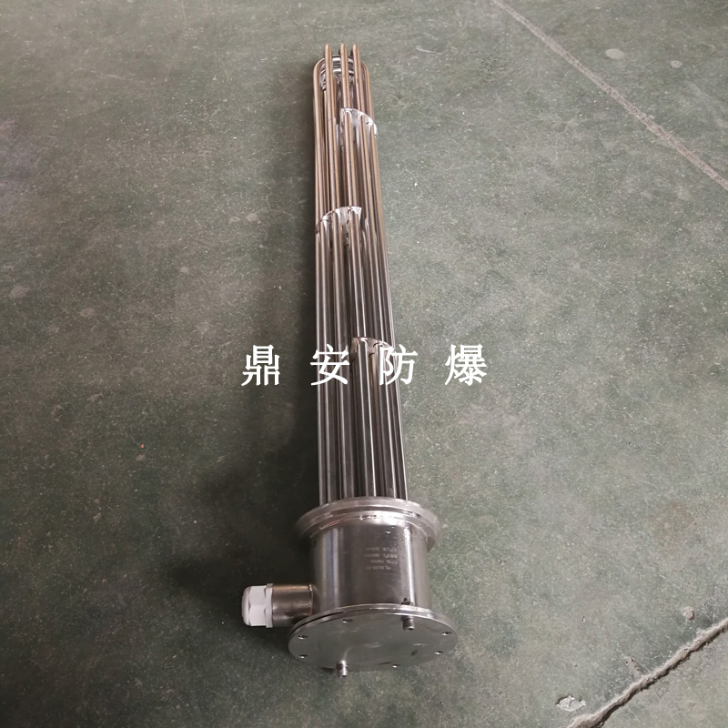 法蘭電熱管(也稱插入式電加熱器):是采用U型管狀電熱元件,多支U型電熱管焊接在法蘭上集中加熱,依據加熱不同介質設計規范,按照功率配置要求裝配在法蘭蓋上,插入需加熱物料中,發熱元件工作時所發出的大量熱量傳導給被加熱介質使介質溫度升高,達到所需的工藝要求,主要用于敞開式、封閉式的溶液箱和循環系統中加熱用。